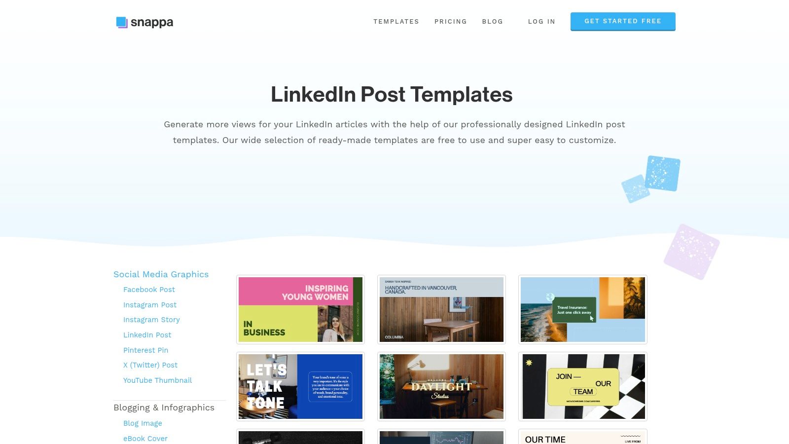 - LinkedIn-Specific Templates: Pre-sized templates for LinkedIn headers, posts, and infographics.
