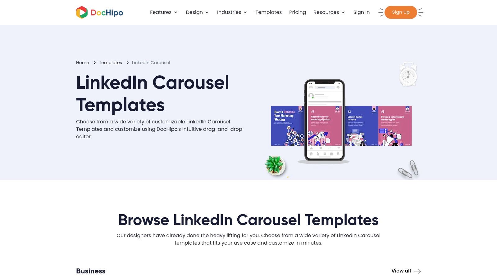DocHipo is a user-friendly design tool that carves out a niche by offering a dedicated collection of LinkedIn carousel templates. It streamlines the creation process for this specific, high-engagement post format. The platform is built around a simple drag-and-drop editor, making it accessible for users who want to create professional-looking documents without a steep learning curve.