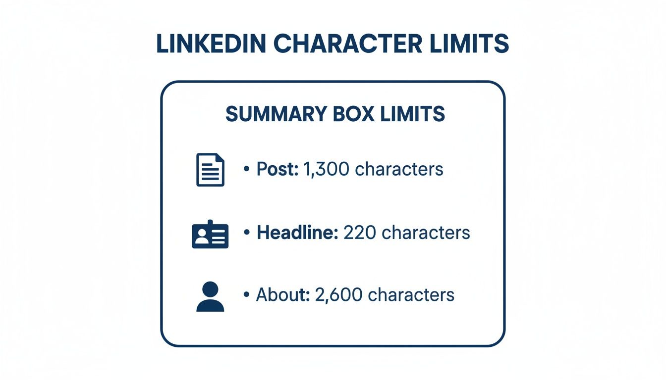 While the main feed gets most of the glory, your LinkedIn profile is the bedrock of your professional brand. Every single section is a chance to shape your narrative, but each one has its own character limit you have to work with. Getting this right is absolutely crucial for making a strong first impression.