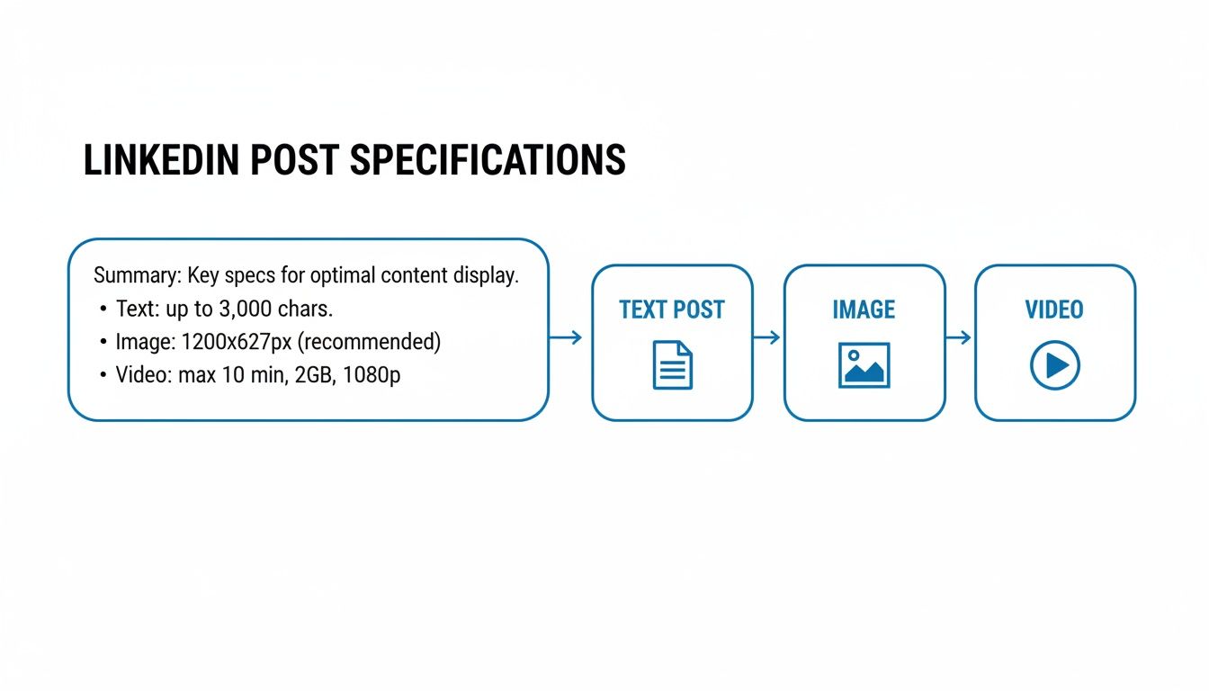 When we talk about LinkedIn post specs, we're really talking about the technical rules of the road for your content. This includes things like the 3,000-character limit for text posts, the ideal 1200x627 pixel size for images in a link preview, and the 10-minute maximum for native videos.